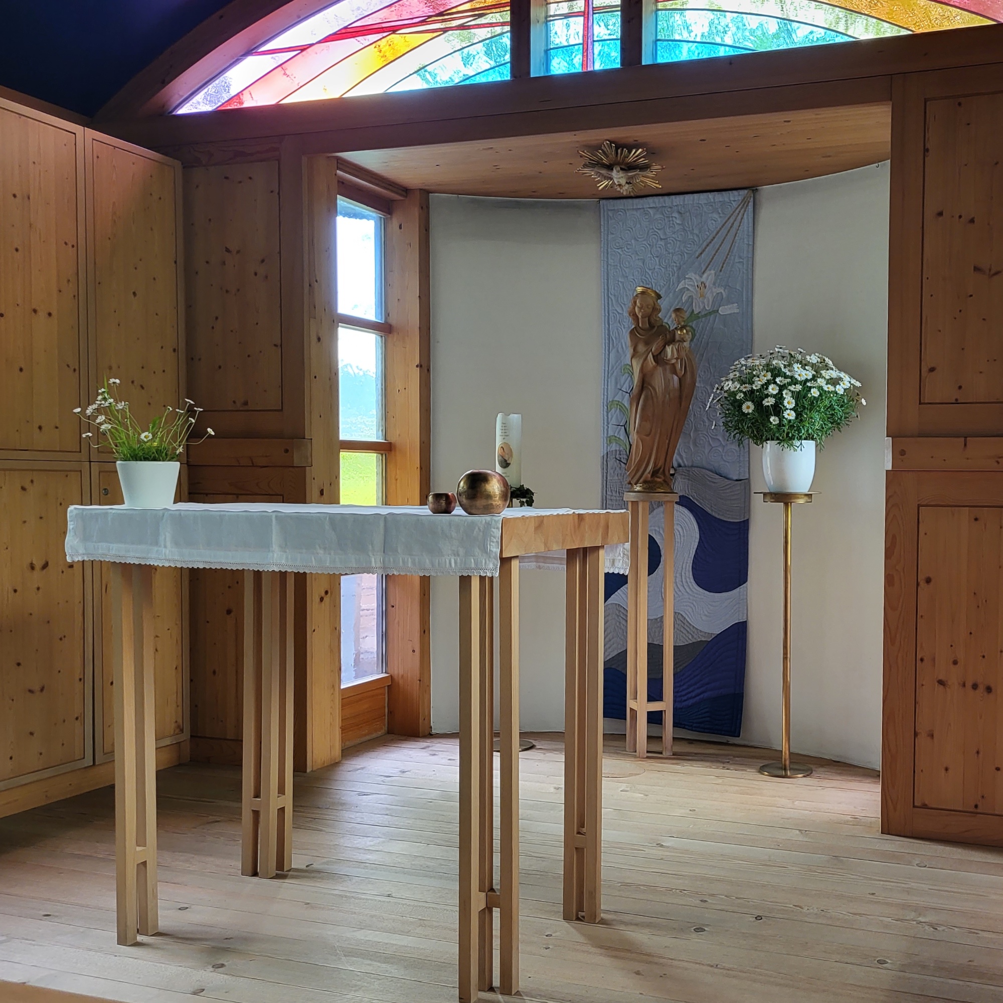 Der schöne Blumenschmuck im Gemeinschaftsraum, auf den Esstischen, in den Schlafräumen, in den Gängen, in der Hauskapelle und in der Kirche war wohltuend und liess einen die Sorgen in der Welt vergessen. Die schöpferische und äusserst aktive Sr. Maria schimmerte dabei überall durch. Ihr fröhliches Harfenspiel war wohltuend, erfrischend und brachte einen zum Staunen. König David wäre mit seinen Psalmen sicher begeistert gewesen. Der Kreuzweg im Klostergarten mit seinen Flachreliefs, ebenfalls von Sr. Maria modelliert, trug ebenso viel zur glaubenstragenden Gastfreundschaft bei. Da waren die gackernden Hühner während des Kreuzweg-Gebets kein Hindernis. Auch ihre Ikonenmalerei ist eindrücklich, ganz besonders die drei Ikonen an der Frontseite des Altars in der Hauskapelle, die neueren Datums sind (siehe Foto). Es sind dies Ikonen mit der heiligenCaterina, mit dem Guten Hirten und mit dem heiligen Dominikus. Sie ergeben ein schönes Gesamtbild vom Altar.