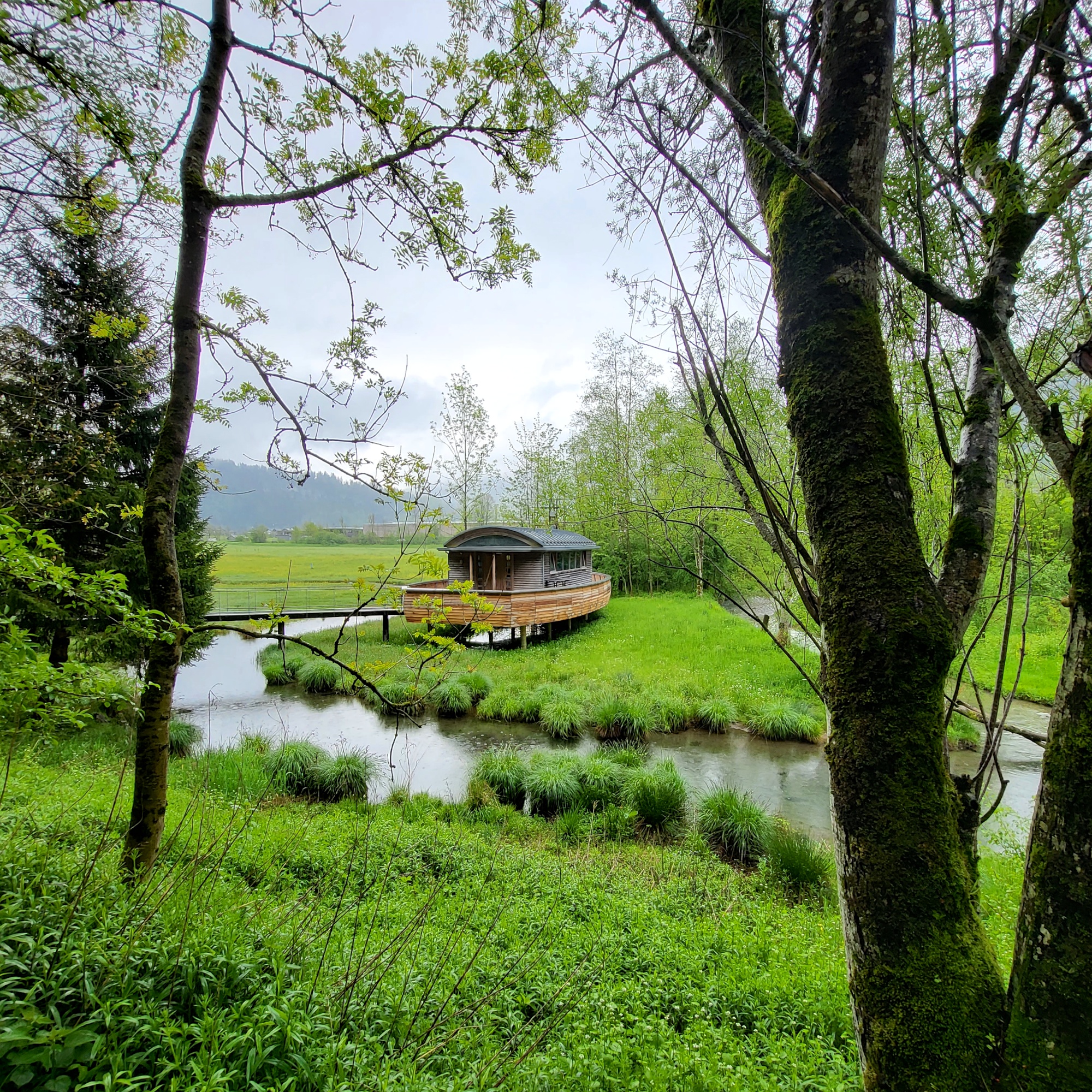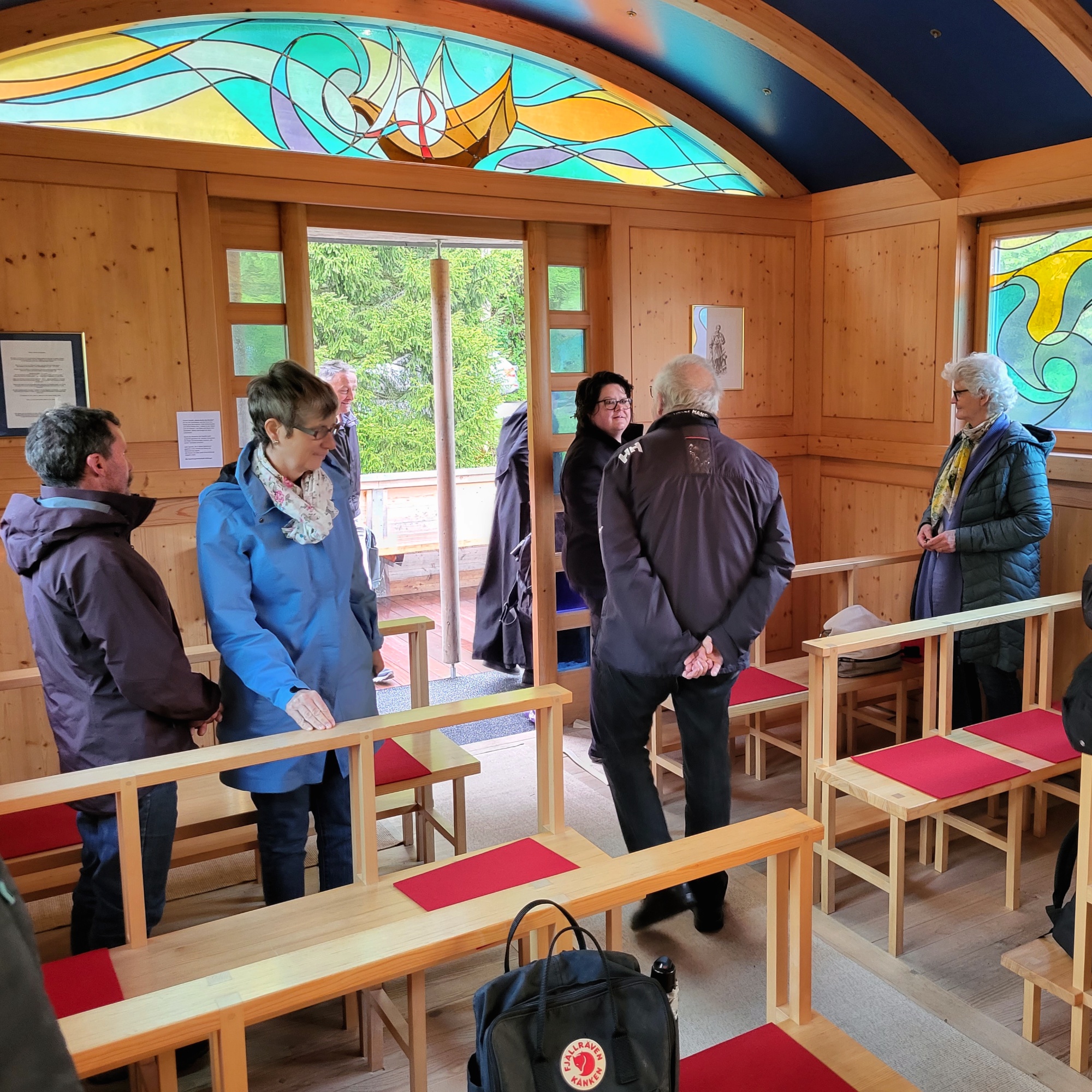 Auf unserem Programm stand auch der obligate Ausflug am Samstag. Wir hatten natürlich wieder einmal mehr dem Ausflugsziel entsprechendes Wetter, ohne Schirm war nämlich nichts zu machen. Unser Ziel war eine kleine Arche (siehe Foto), wo es bekanntlich nur noch regnete. Der Regen brachte uns in die Stimmung von Noah und seiner Familie. Wir erreichten die Arche mitten in der Natur nach einer abwechslungsreichen Autofahrt. Zum Schiffchen – oder eben zur Arche – gelangt man zu Fuss über einen längeren schmalen Steg über sumpfiges Gelände am Rande eines Waldes. Unsere Arche war eine Miniaturausgabe, vollständig aus Holz, aussen rundherum begehbar. Natürlich waren darin keine Tiere zu finden. Der einzige Raum bestand aus einer kleinen Schiffskapelle mit einfachen Bänken und einem grazilen, kleinen Altar. Dahinter stand eine schöne Maria-mit-Kind-Statue aus Holz vor einem kunstvollen Patchwork-Teppich. Trotz Regen leuchteten die Fenster hell. Noah hätte hier sicher mit Freude Gottesdienst gefeiert und auf die Erlösung gewartet. Der schlichte Raum lud zum längeren Verweilen ein und es war schön, als Pater Bruno das Mittagsgebet anstimmte und wir anschliessend drei Rosenkranzgesätze gemeinsam beten durften.