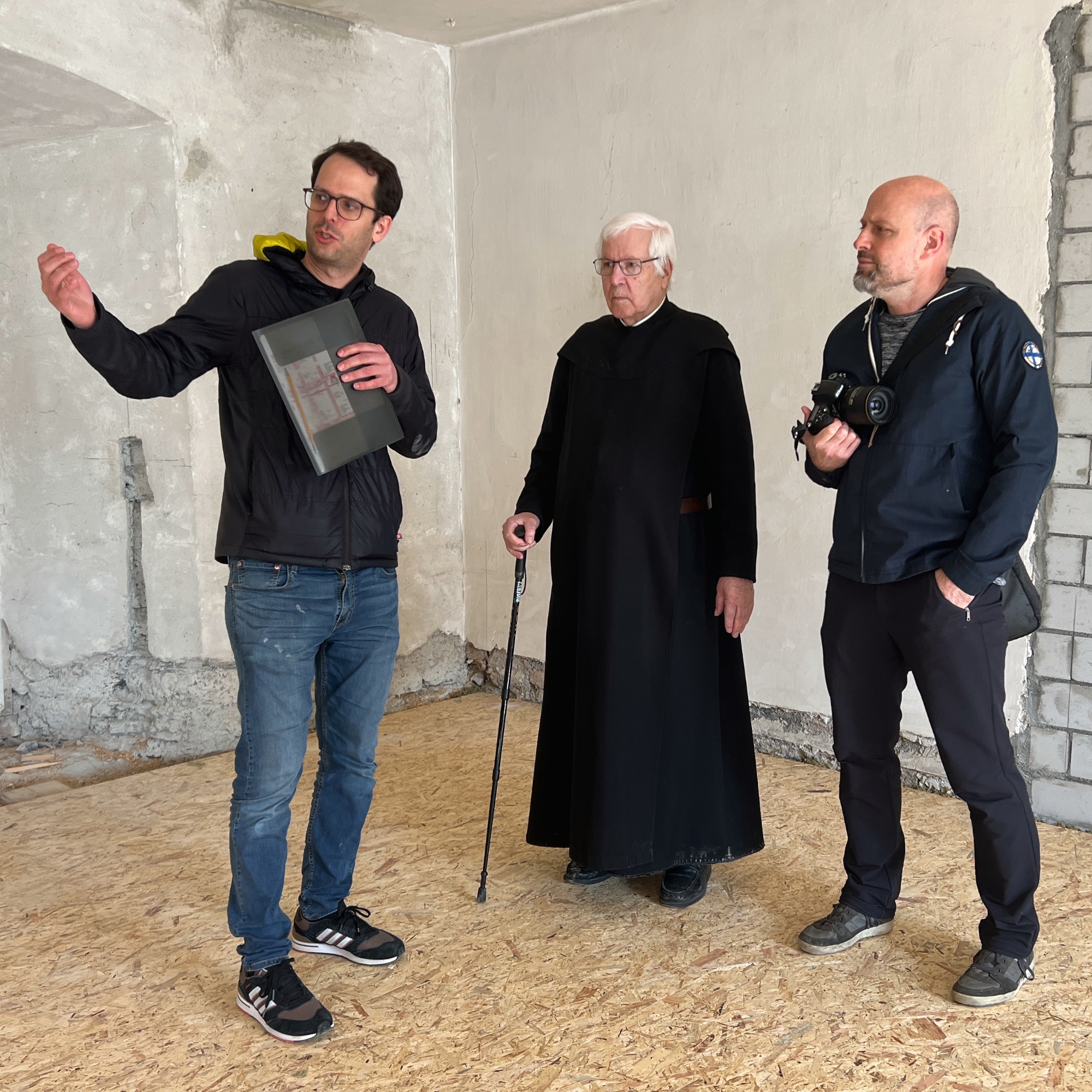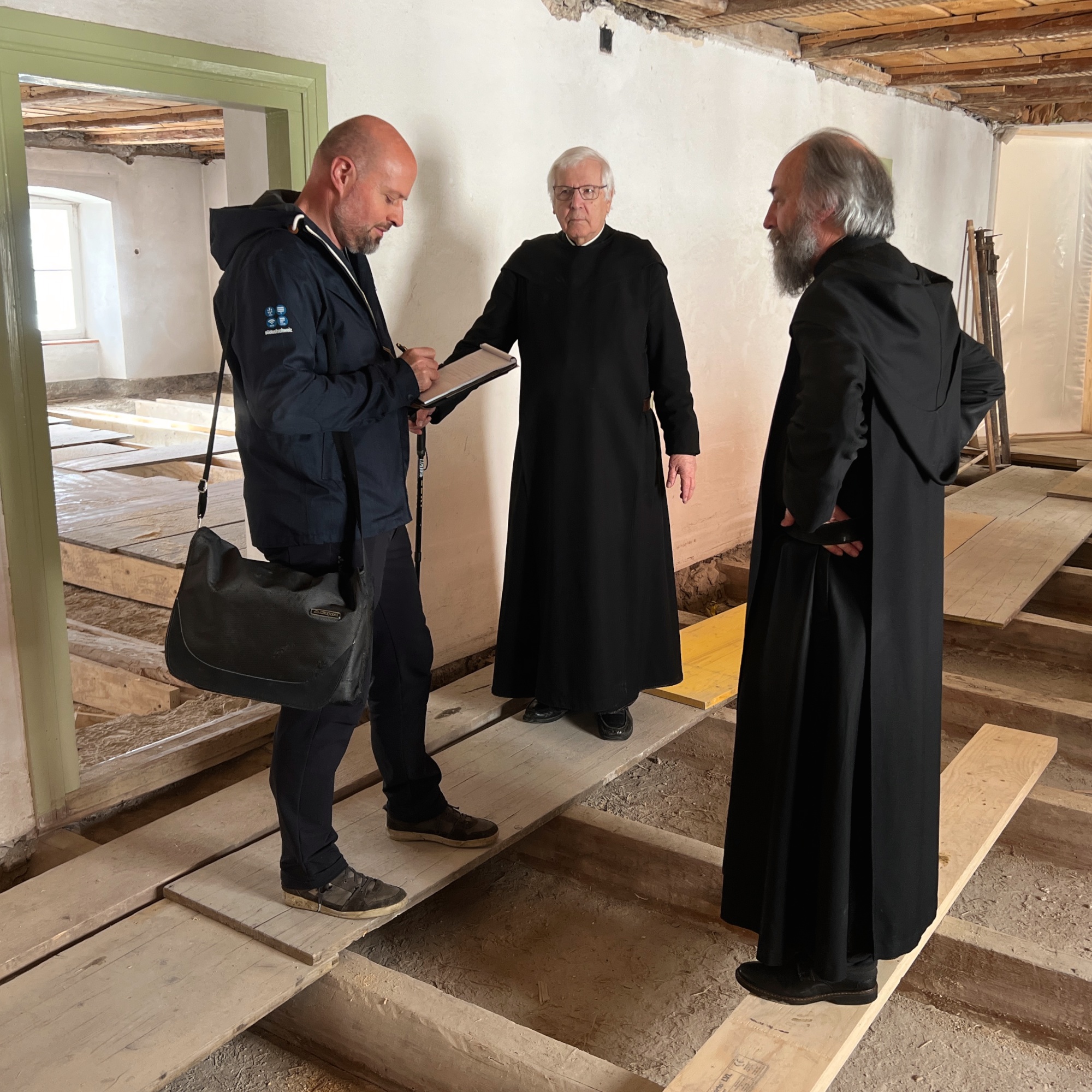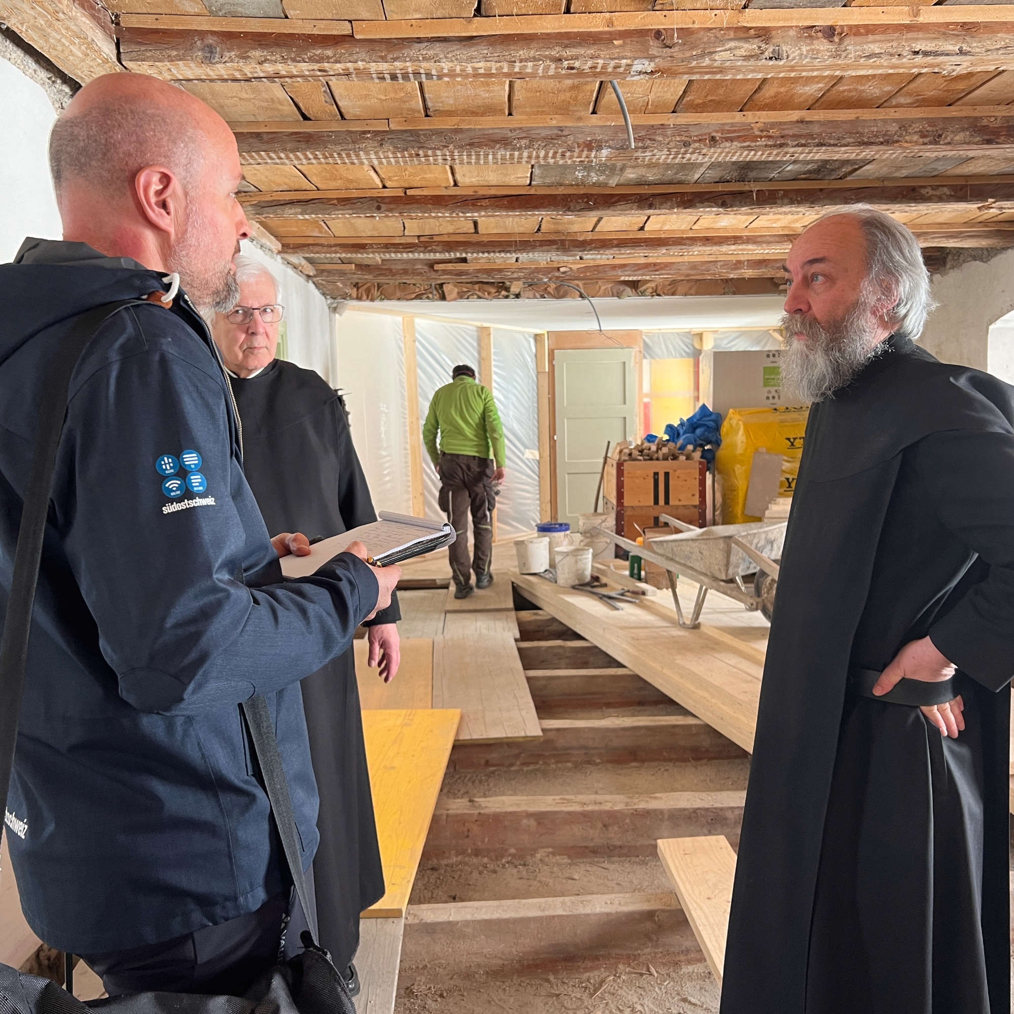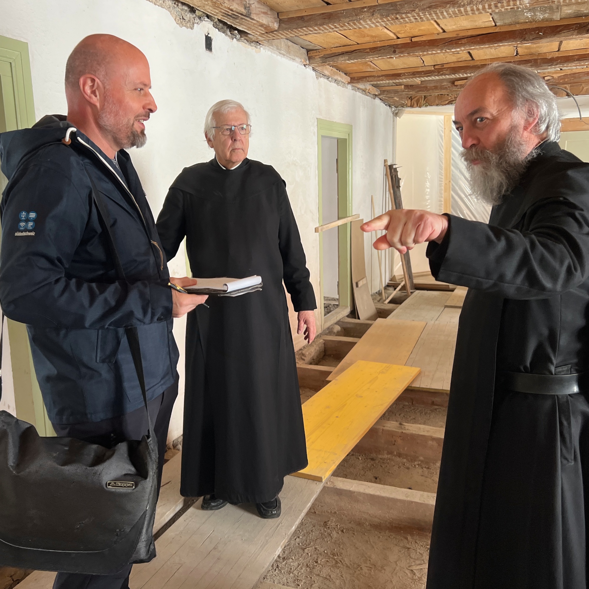 Im Gespräch mit Pater Pirmin Gnädinger, der den Bau für den Konvent koordiniert, Pater Theo Theiler, einem der letzten Bewohner der uralten Mönchszellen, Architekt Paul Schmidt sowie Judith Huonder aus der Geschäftsleitung des Klosters und Abt Vigeli Monn, liess er sich zu Planungen und zum Fortgang der Arbeiten informieren.