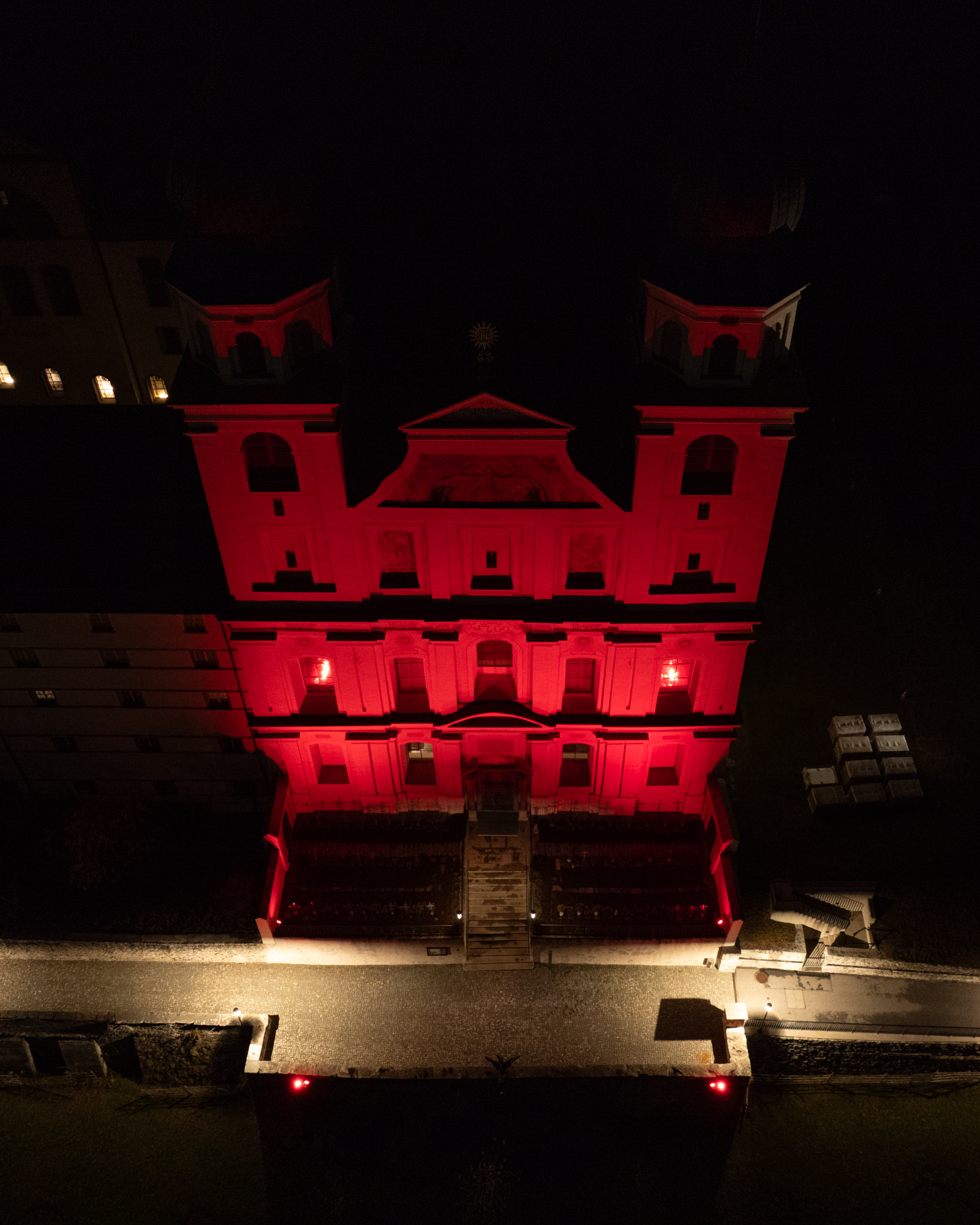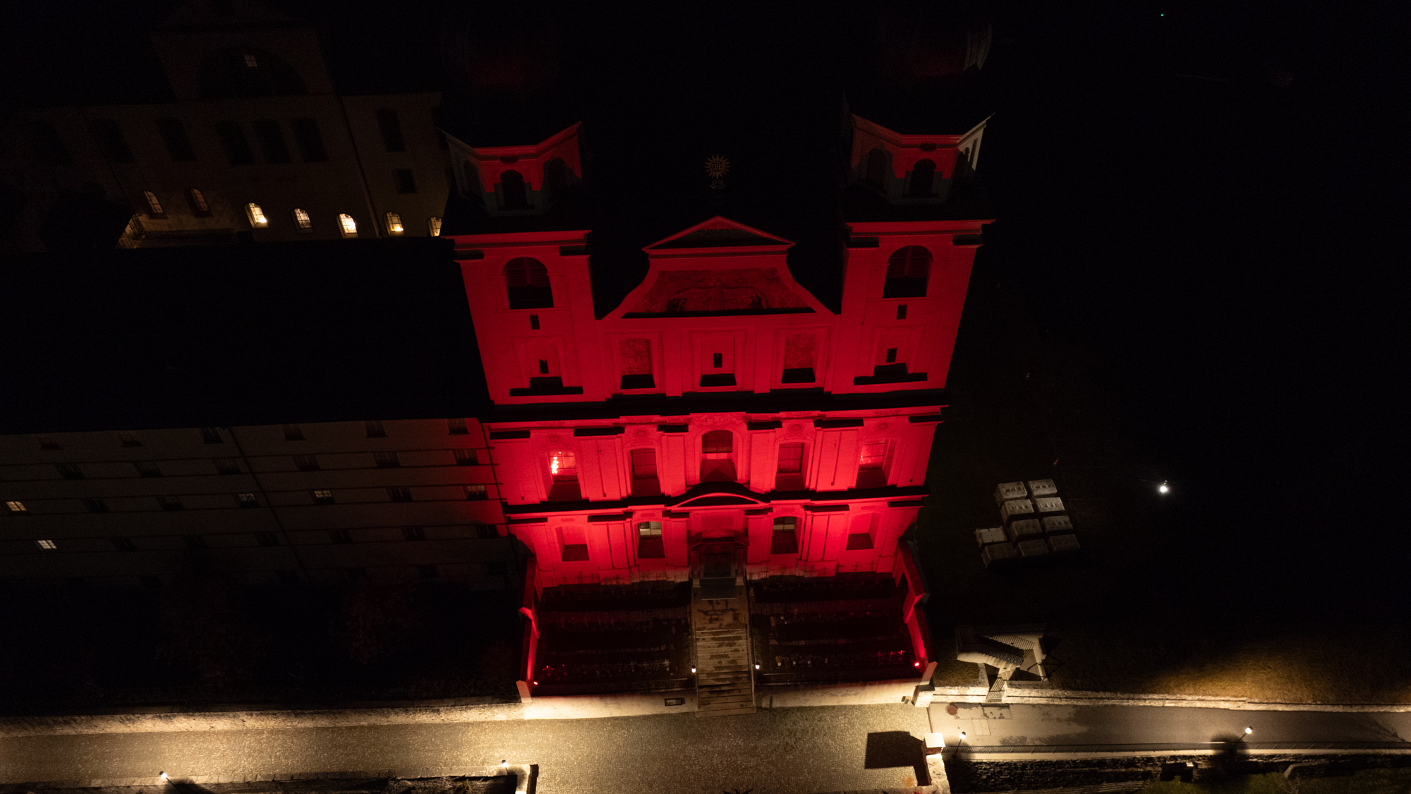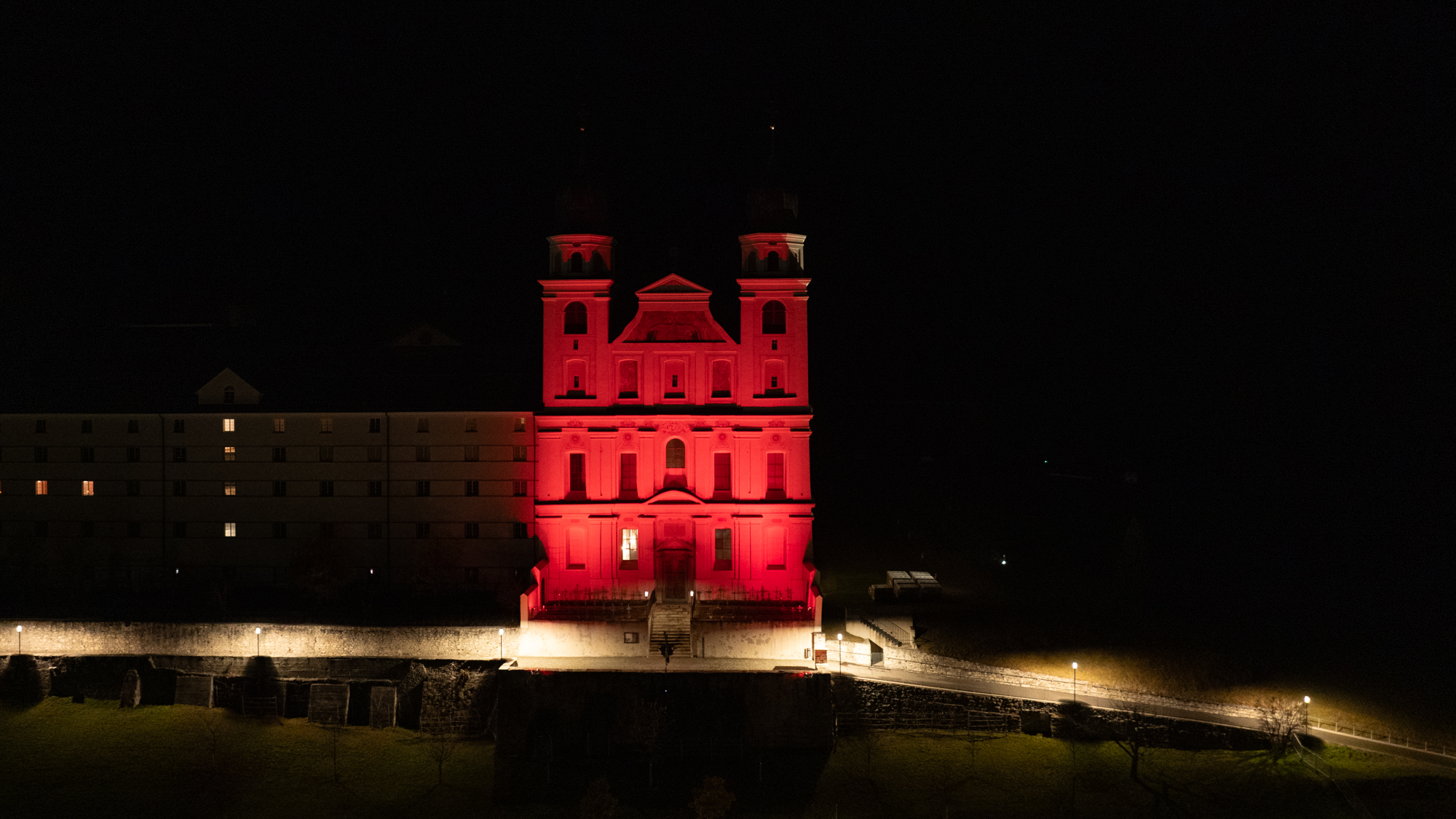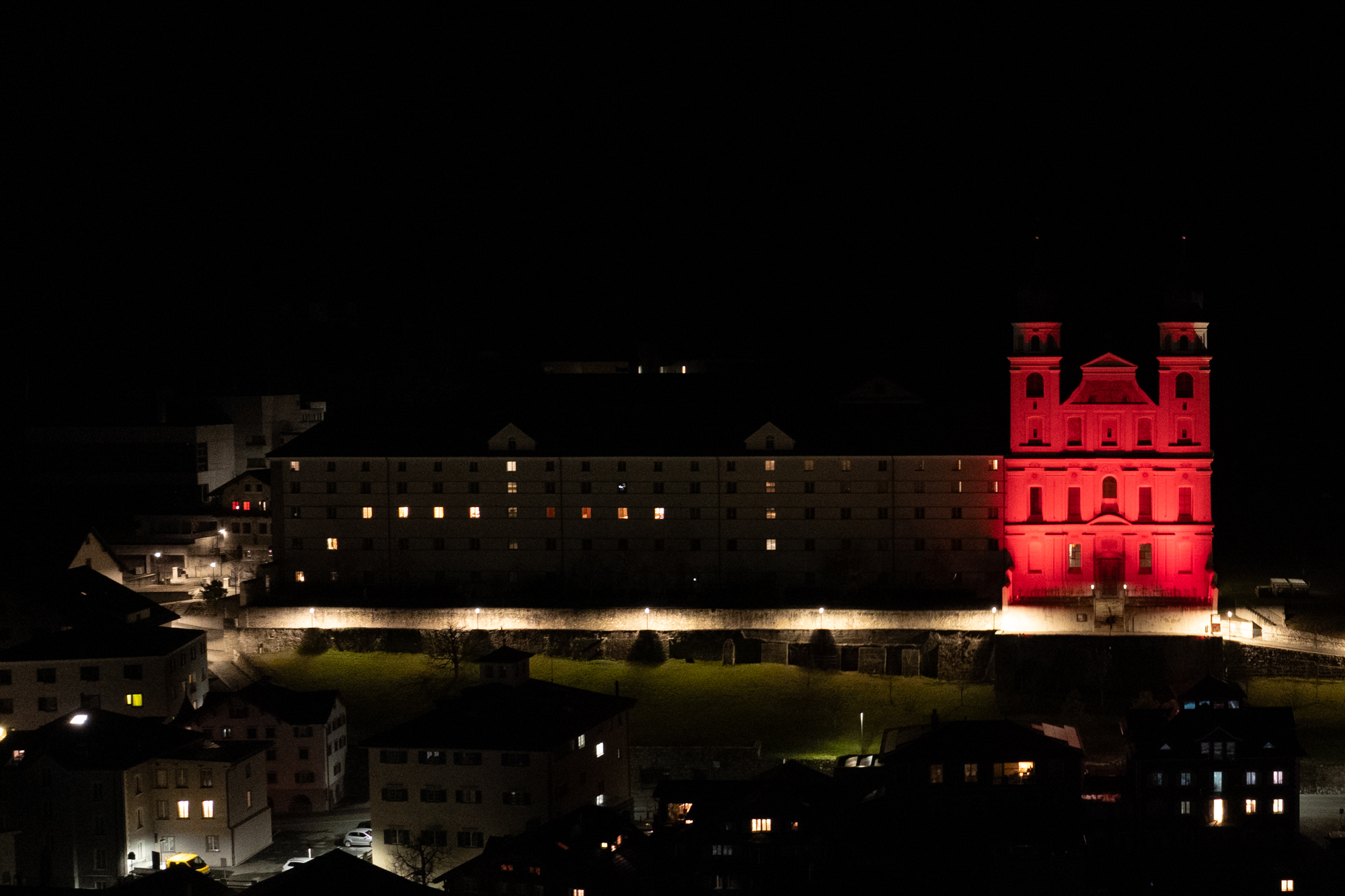 Gemeinsam mit vielen tausend Gemeinden auf der ganzen Welt engagiert sich das Kloster Disentis, um auf die Diskriminierung und Gewalt gegenüber Christen hinzuweisen. Das in roter Farbe beleuchtete Kirchengebäude soll auf das weltweite Blutvergiessen aufmerksam machen.