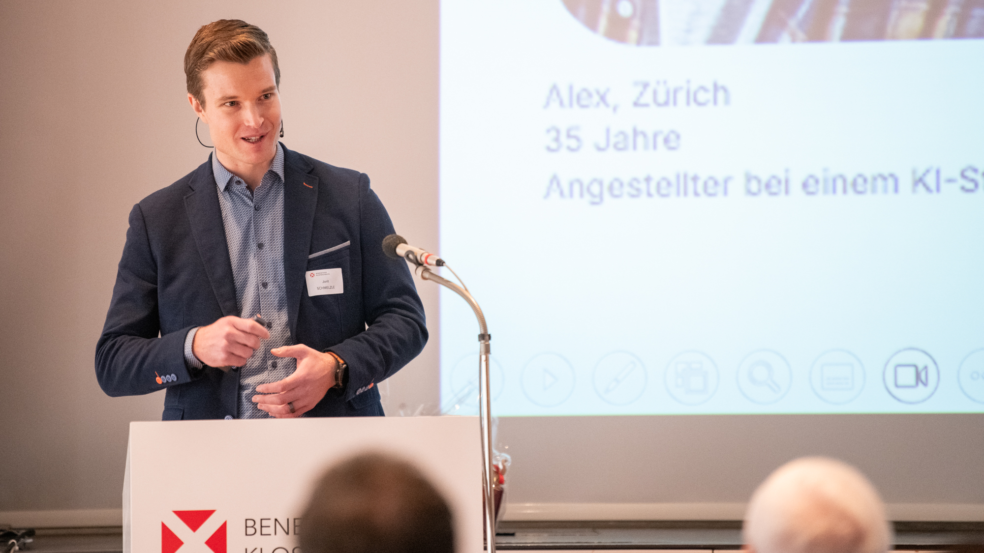 Nach der Mittagshore und einem Mittagessen aus der Klosterküche nahm Jorit Schmelzle, Experte für künstliche Intelligenz und maschinelles Lernen, die Gäste mit auf eine Reise in das Denken der Maschinen. Anhand von Praxisbeispielen zeigte er, wie KI unser Leben bereits heute begleitet und beeinflusst. Zudem gab er spannende Einblicke in die Fähigkeiten und Grenzen dieser Technologie und beleuchtete die Chancen sowie Risiken, die ihre Weiterentwicklung mit sich bringt.