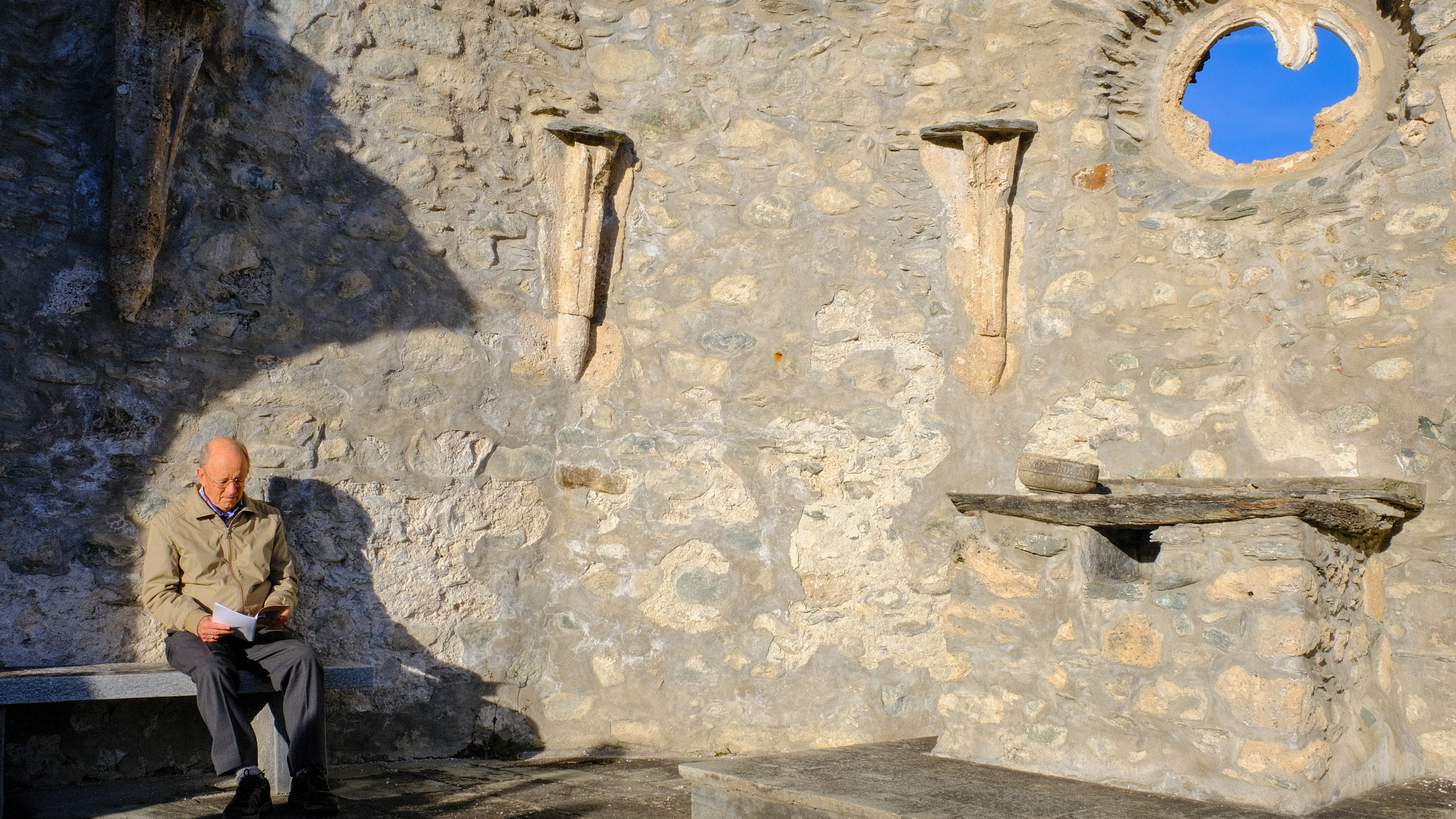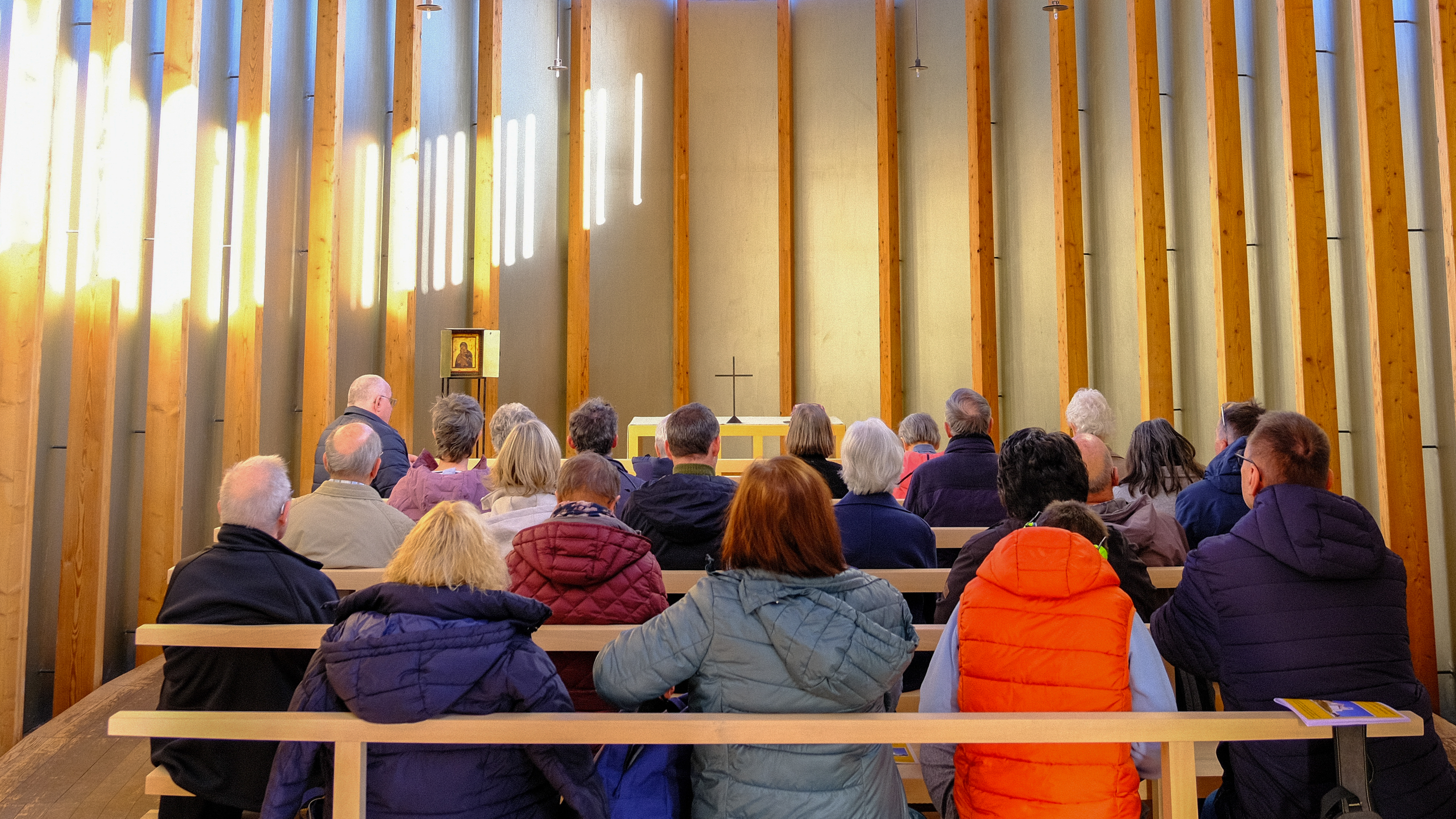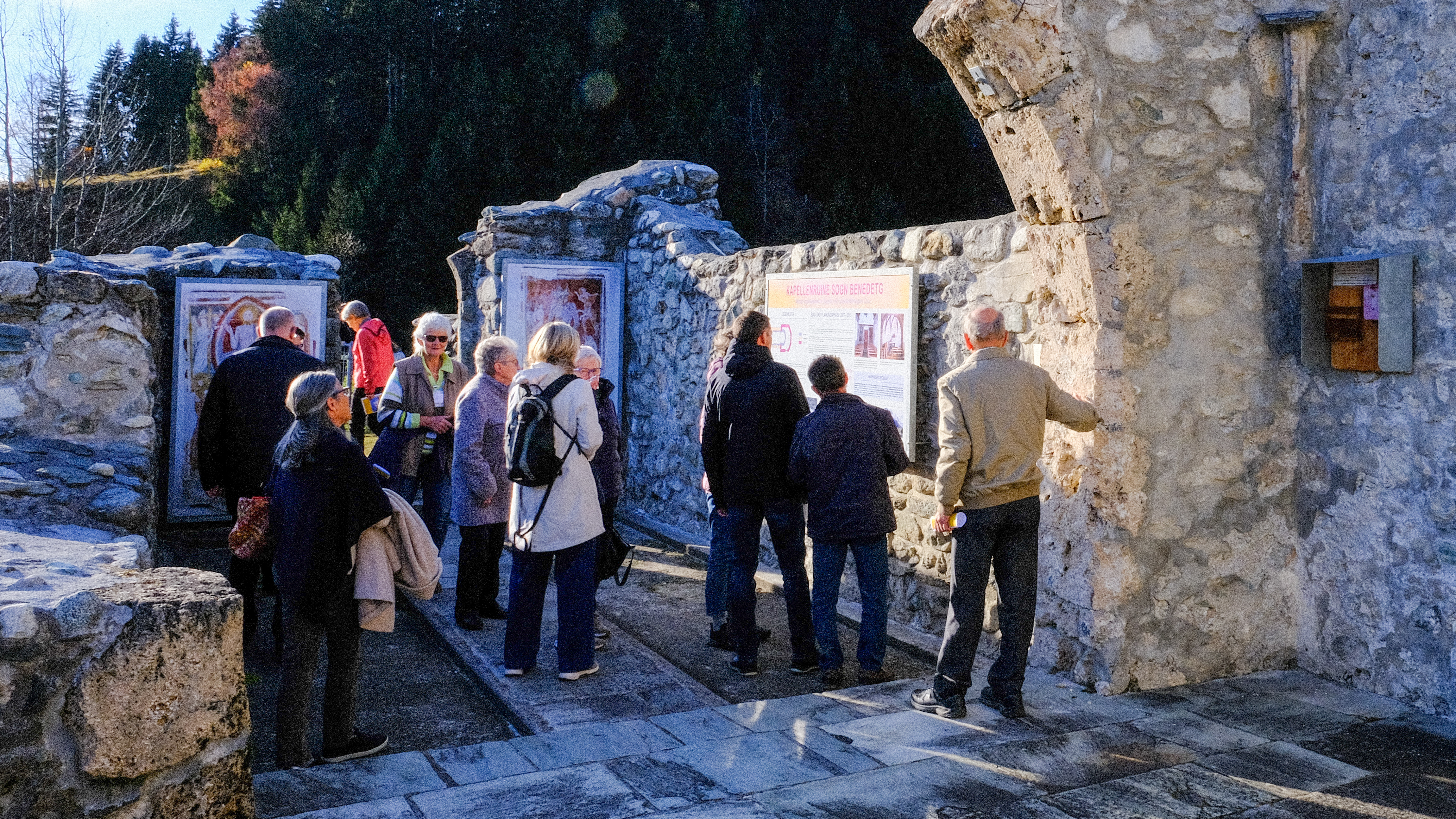 Neben diesen tiefgründigen geistlichen Impulsen kam auch die Geselligkeit in unserer Runde nicht zu kurz. Am Samstag machten wir einen Ausflug zur Kapelle Sogn Benedetg oberhalb von Sumvitg. Diese wegen ihrer Form, ihres Lichteinfalls und ihres leiterartigen Glockenturms berühmte Kapelle wurde in den 80er Jahren nach dem Entwurf von Peter Zumthor und Annalisa Zumthor-Cuorad gebaut, nachdem die alte Kapelle von einer Lawine zerstört worden war.