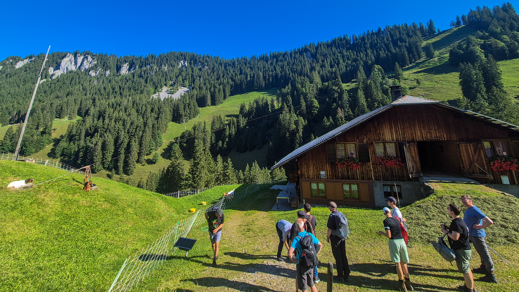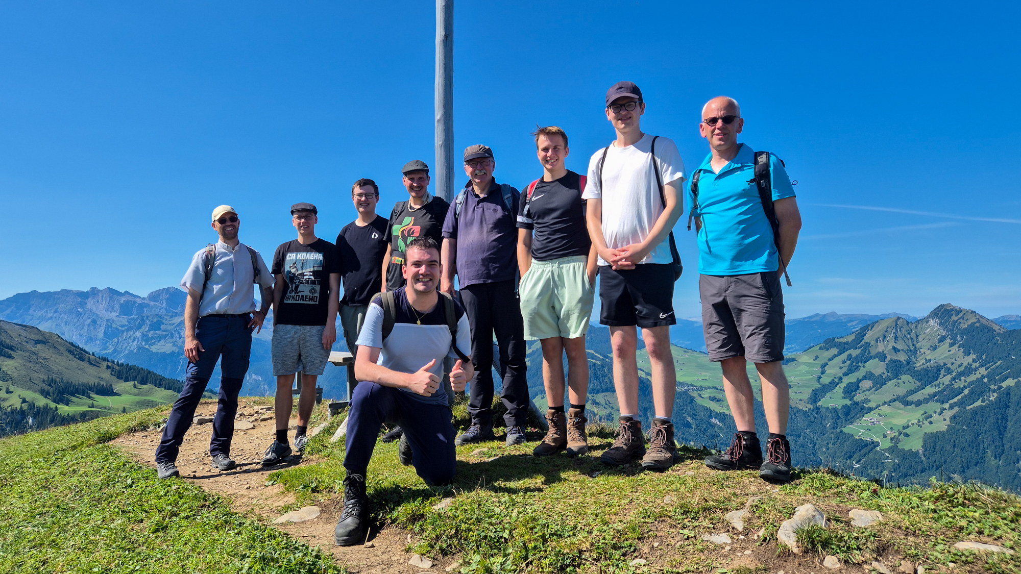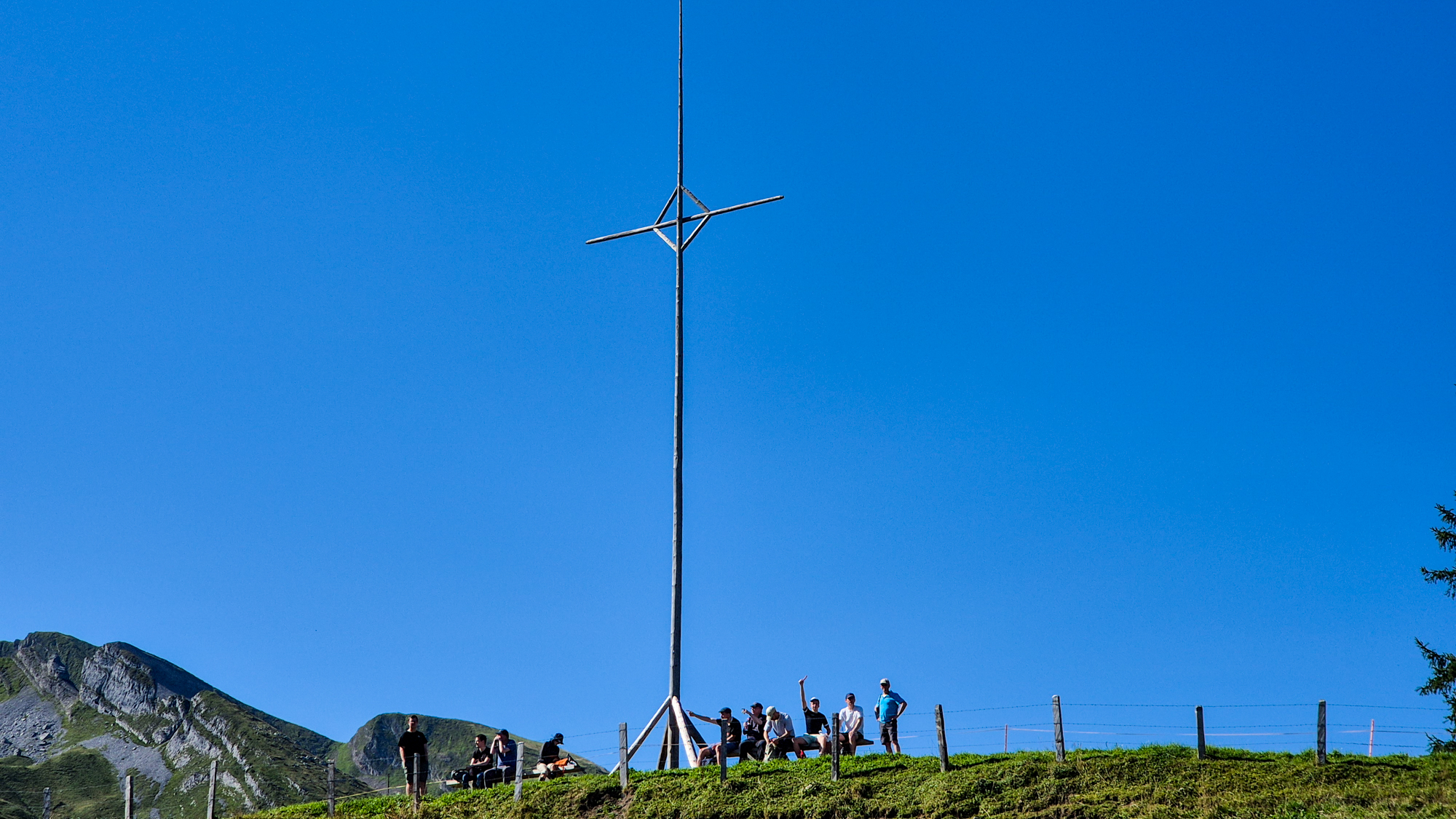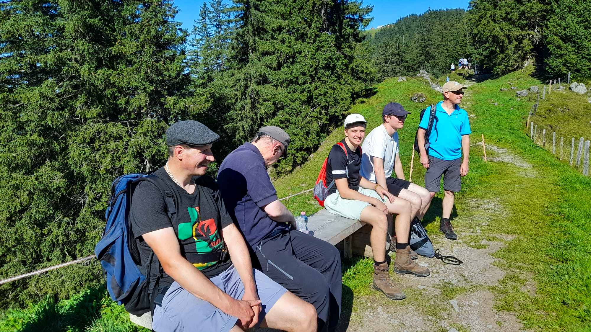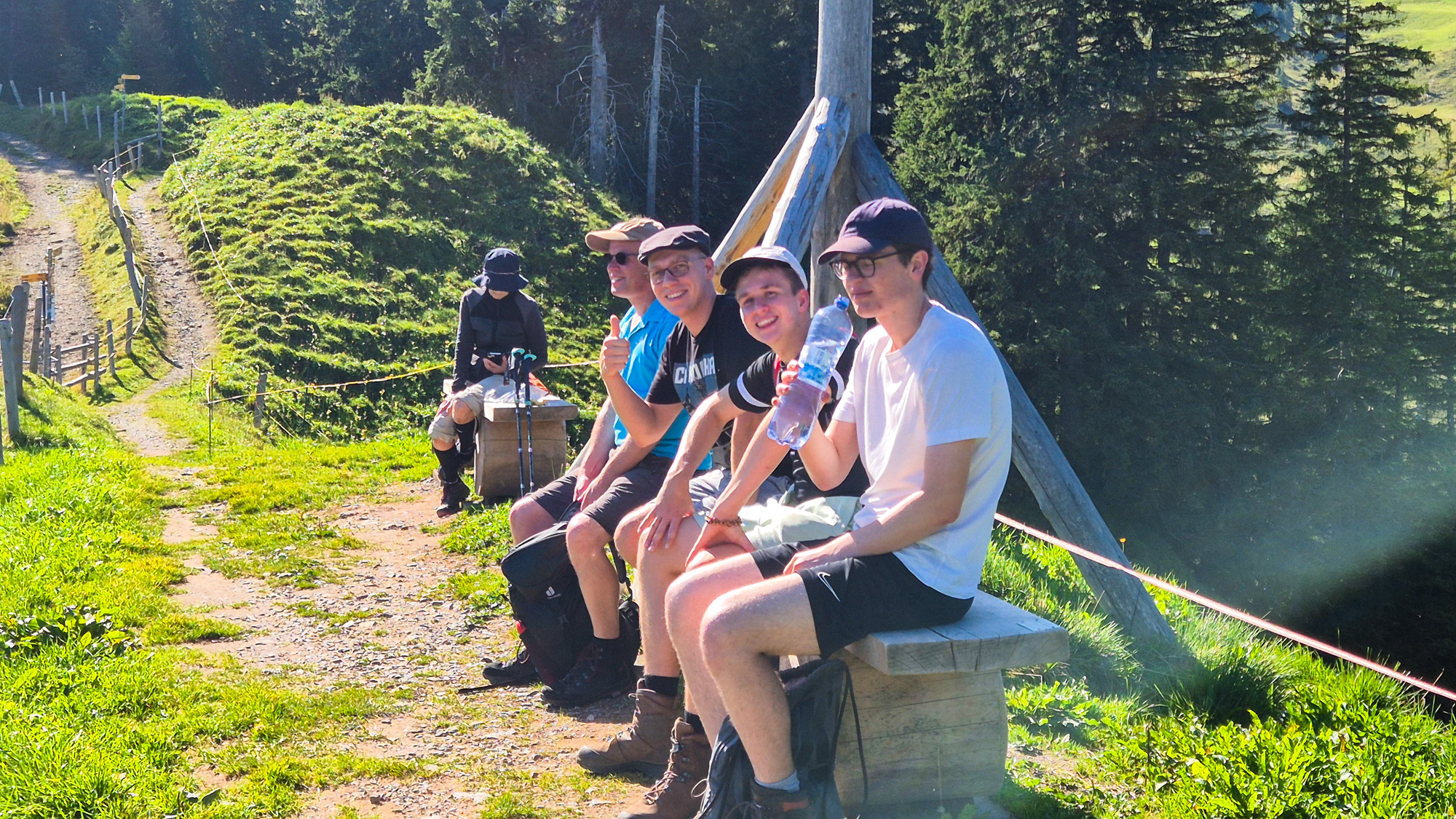 Bei weiterhin hervorragendem Wetter und angenehmen Temperaturen konnten wir – aufgrund der exzellenten Ausgangslage auf rund 1160 Metern – nach Laudes, heiliger Messe und Frühstück direkt vom Kloster aufbrechen. Weil wir zur Vesper um 16 Uhr zurück sein wollten, um anschliessend noch einen Film über die Wüstenväter anzuschauen, konnten wir nicht wie angepeilt den Brisen (2403 Meter) besteigen; trotzdem fehlte es unserer Wanderung nicht an Aussicht. Wir machten eine Art Rundwanderung mit dem Ziel Musenalp. Dort angekommen, gingen wir noch ein Stück weiter zu einem Aussichtspunkt, von dem sich uns ein Rundum-Panoramablick auf Pilatus, Luzern, Vierwaldstättersee, Rigi, Mythen, Brisen und sogar bis zu den Viertausendern im Berner Oberland bot. Nach Gruppenfoto und Einkehr auf der Alphütte stiegen wir auf anderem Wege wieder hinab, um rechtzeitig zurück im Kloster zu sein.