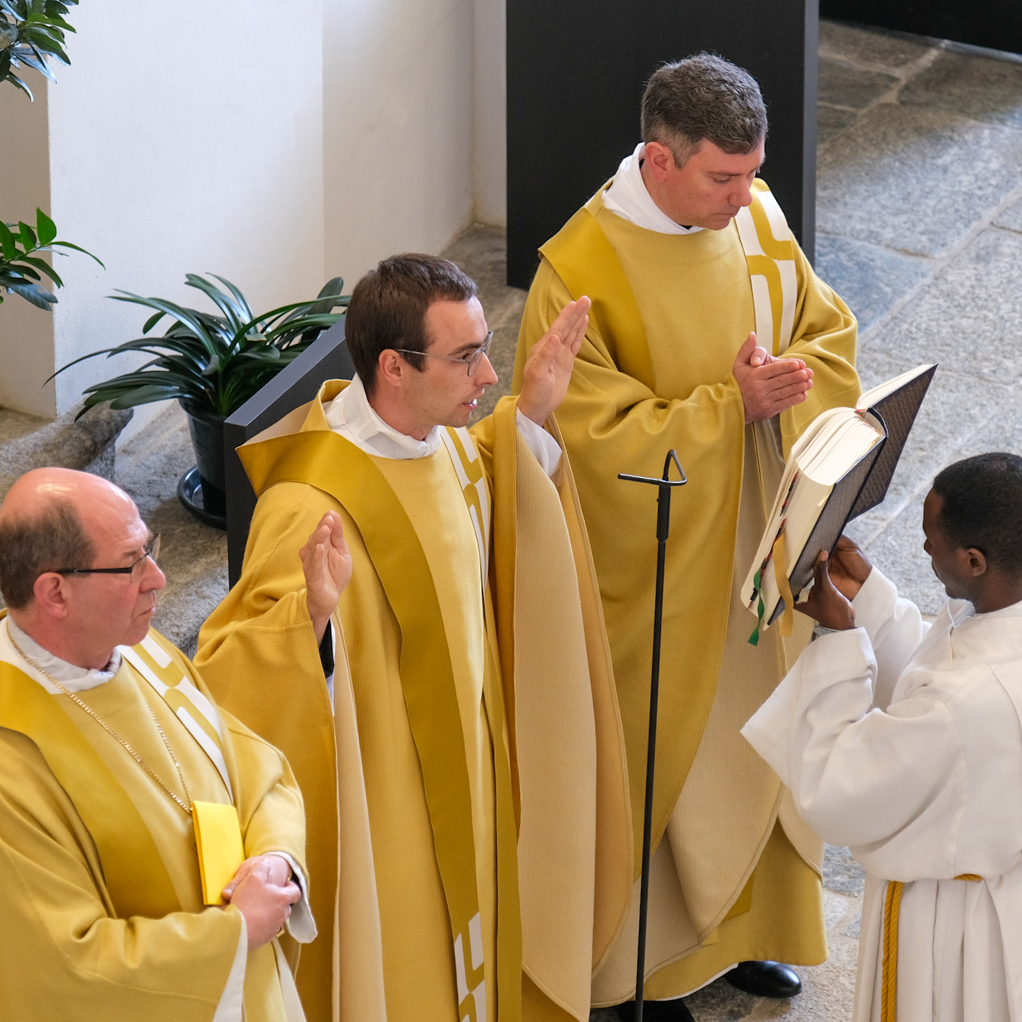 Aber nicht die Ruhe ist nun für Dich mit der Priesterweihe in ein neues Stadium getreten, sondern eher die Unruhe, die Sehnsucht. Wir Mönche leben nicht, wie manch Außenstehende es fälschlich annehmen, für uns allein, und noch weniger tut dies der Priester. Er nimmt in besonderer Weise teil an der Sorge des HERRN für den großen Garten seiner Schöpfung. Dieser Garten kennt nicht gerade wenig an Unordnung und Unheil. Er bedarf dringend der Frucht der Erlösung. Das zeigt uns nicht nur die Klarsicht auf die Welt da draußen, sondern auch ein ehrlicher Blick auf den Garten unserer eigenen Seele. Aber schon die Gartenmotivik des Johannesevangeliums lässt uns in einen Abgrund blicken: Ein Garten war es, in dem Jesus verhaftet worden ist (vgl. Joh 18,1), in dem er sich selbst für uns auslieferte. Lieber P. Murezi, auch Du als Priester bist entprivatisiert worden, in einer noch tiefergehenden Weise als bisher. Du gehörst jetzt wirklich ganz Ihm (vgl. Jes 43,1). Und ein Garten war es wiederum auch, in dem der Leichnam Jesu bestattet worden ist (vgl. Joh 19,41). Auch Du, lieber Neupriester, hast Dein Leben in der Weihe unter das Geheimnis des Kreuzes gestellt. Verhaftung, Kreuz und Grab: Diese drei Koordinaten gehören, wenigstens im übertragenen Sinne, zum Ernst des Lebensentwurfs, den ein Priester auf sich genommen hat. Unser radikaler priesterlicher Dienst an Gott und an den Menschen ist heute in ungeheurem Maße angefochten und unverstanden. Wir sehen das in den Debatten außerhalb der Kirche, und leider auch innerhalb. Dennoch brauchen wir uns die Freude an unserem Dienst von niemandem nehmen zu lassen. Wir dürfen Begegnungen ermöglichen, und zwar mit keinem Geringeren als dem Auferstandenen!