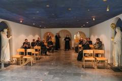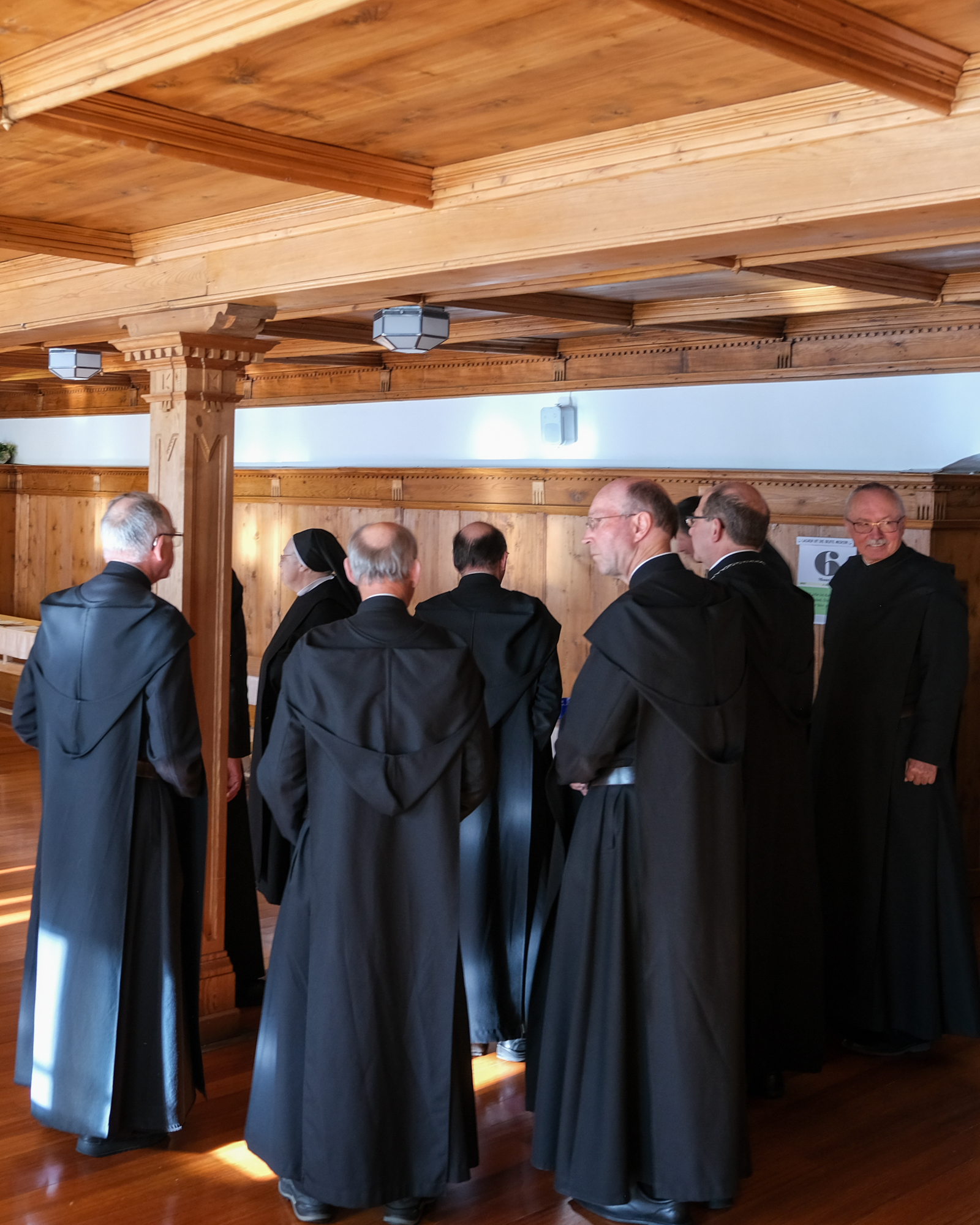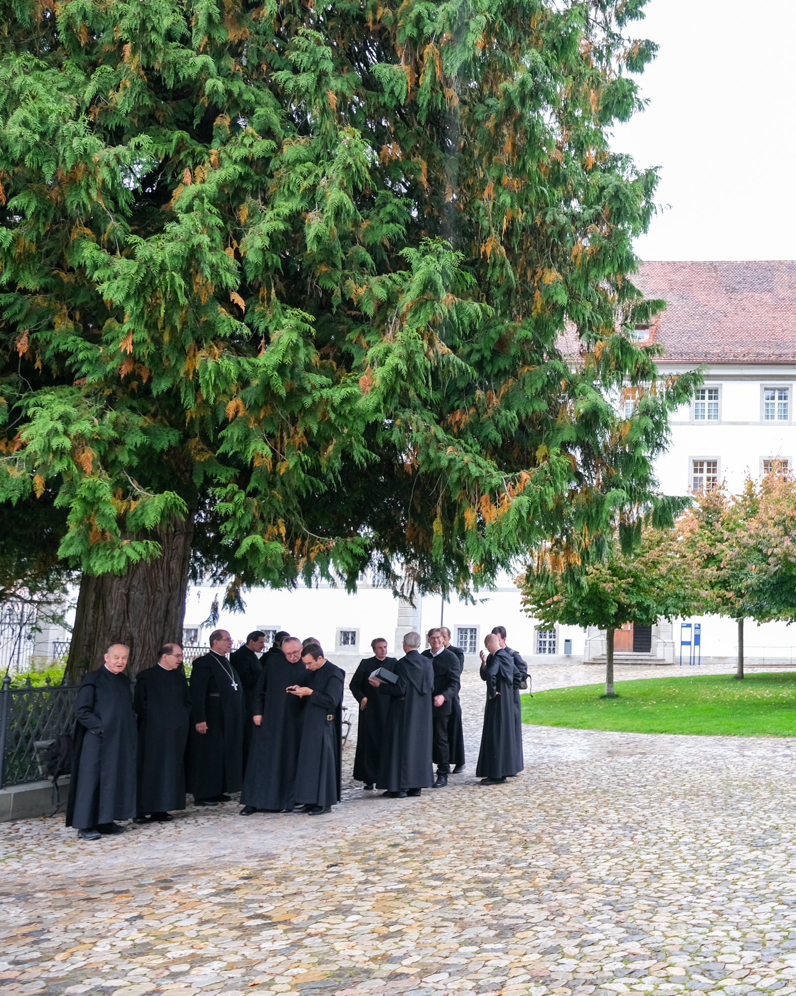 Beim anschliessenden Apéro mischten sich Wiedersehen mit vertrauten Menschen und Begegnungen mit neuen Gesichtern. Aufrichtige Freude zeigte der vor Kurzem emeritierte Bischof von St. Gallen, Markus Büchel, den Disentiser Novizen aus seinem Bistum, Bruder Nicola Brändle, kennenzulernen. Der Tag war so gefüllt mit aufbauenden Begegnungen, dass auch den Abschied von Einsiedeln kein «leider» trübte.