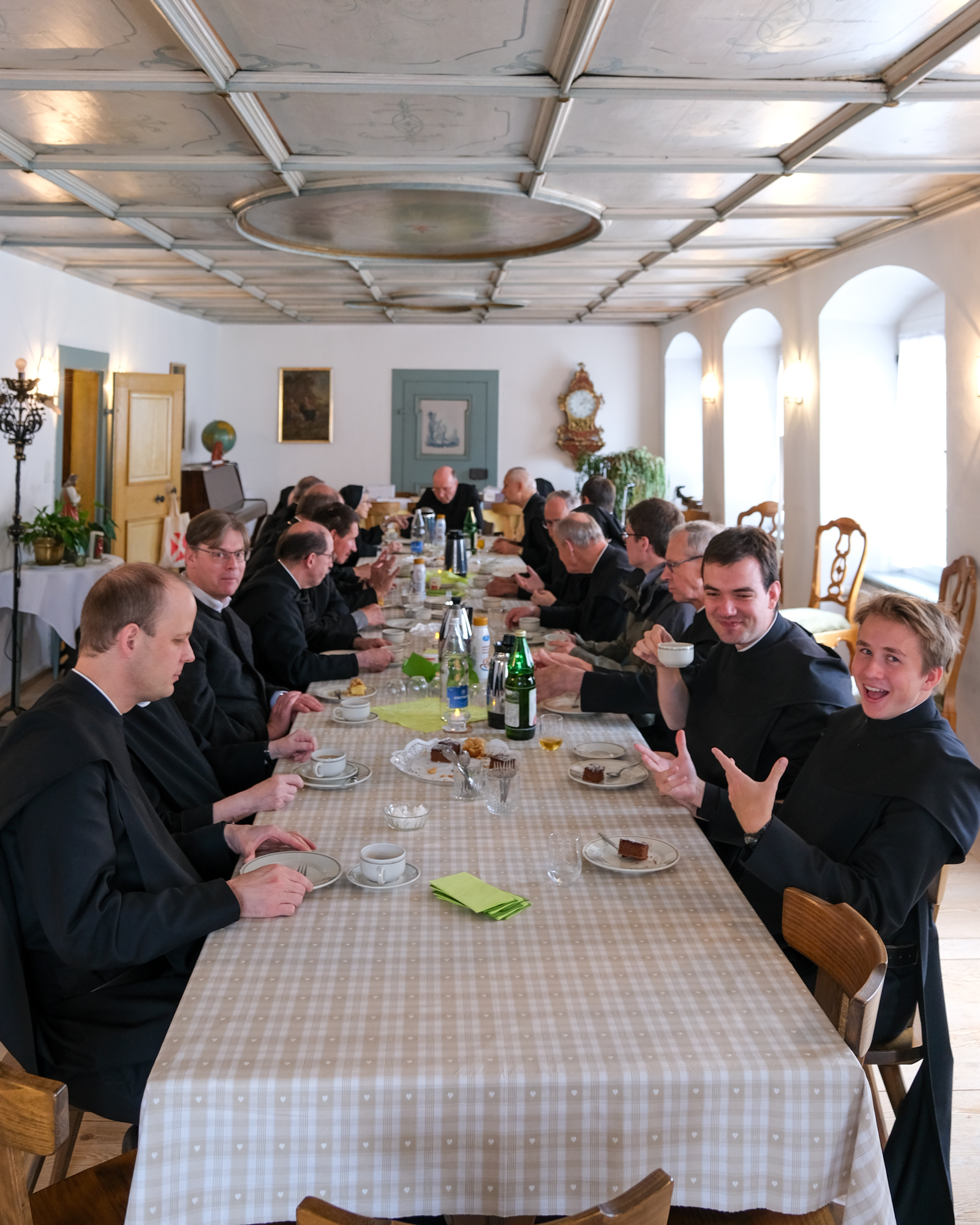 Einige Kilometer zurück nach Einsiedeln – welcher Kontrast: Die mächtige barocke Klosteranlage. Der vor kurzem fertiggestellte, weite Klosterplatz mit Scharen von Pilgern und Touristen aus aller Welt. Eine Gruppe aus den Philippinen ersucht Abt Vigeli Monn und Pater Bruno Rieder um ein gemeinsames Foto und anschliessenden Segen. War das Refektorium in der Au eine heimelige Holzstube, so erwartete in Einsiedeln die Disentiser Mönche ein weiträumiges, reich geziertes Refektorium. Es war bis auf den letzten Platz gefüllt; denn ebenfalls zu Gast war die Appenzeller Standeswallfahrt, deren offizielle Delegation im Refektorium speiste.
