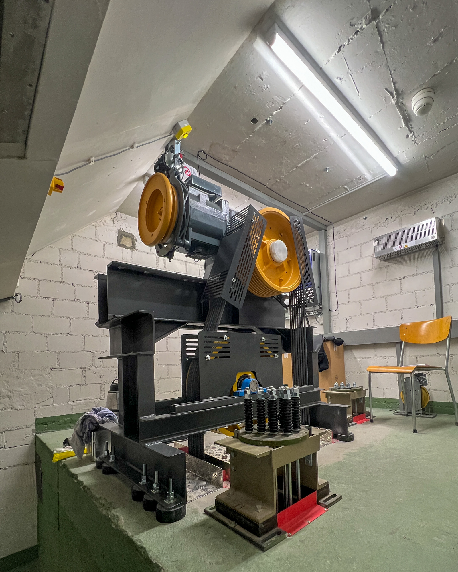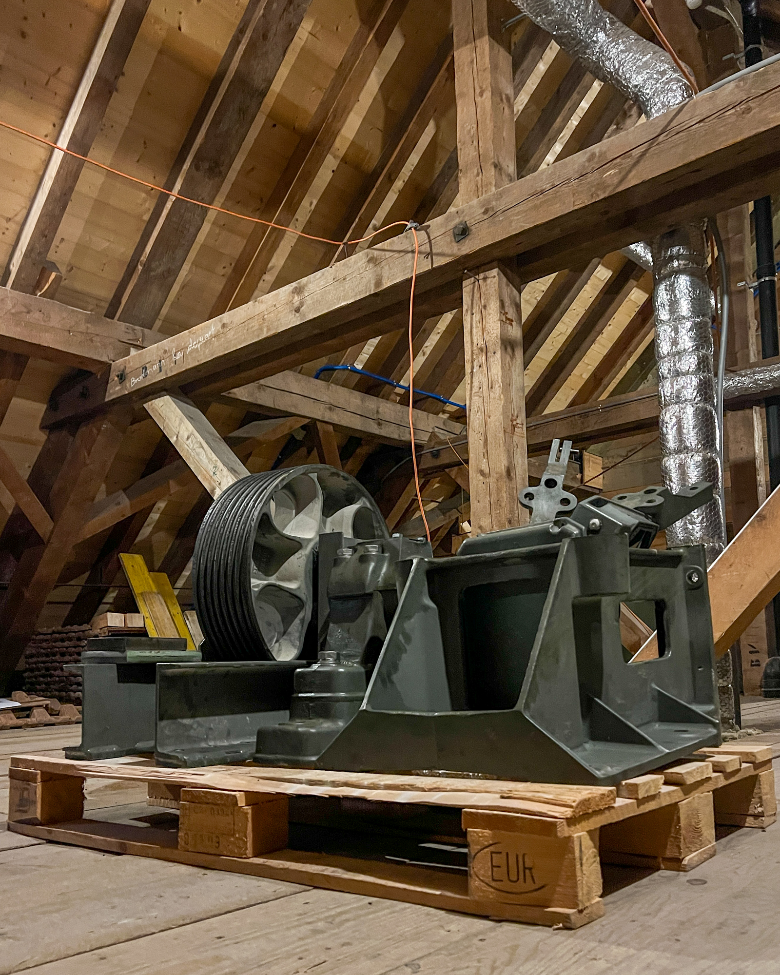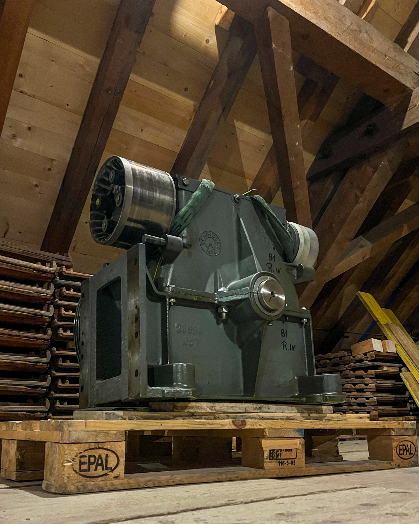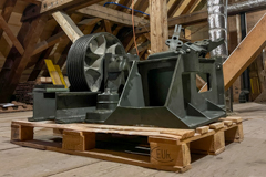 Im Dachgeschoss des Klosters warten jetzt nur noch der alte Motor samt Schaltschrank und Getriebe auf den Abtransport. Alles geht denselben Weg, den auch die neue Technik genommen hatte, um ins Kloster zu gelangen: Über einen eigens installierten Flaschenzug wird der Abschnitt auf das Dachgeschoss und zum Maschinenraum absolviert, dann folgt eine Schräge über die letzten Treppenstufen und der Weitertransport über Hubwagen aus dem Gebäude. Der neue Lift hat mit Testgewichten von insgesamt 2,5 Tonnen seine ersten Fahrten gemacht und wartet nun nur noch auf die Abnahme und Übergabe an das Kloster.
