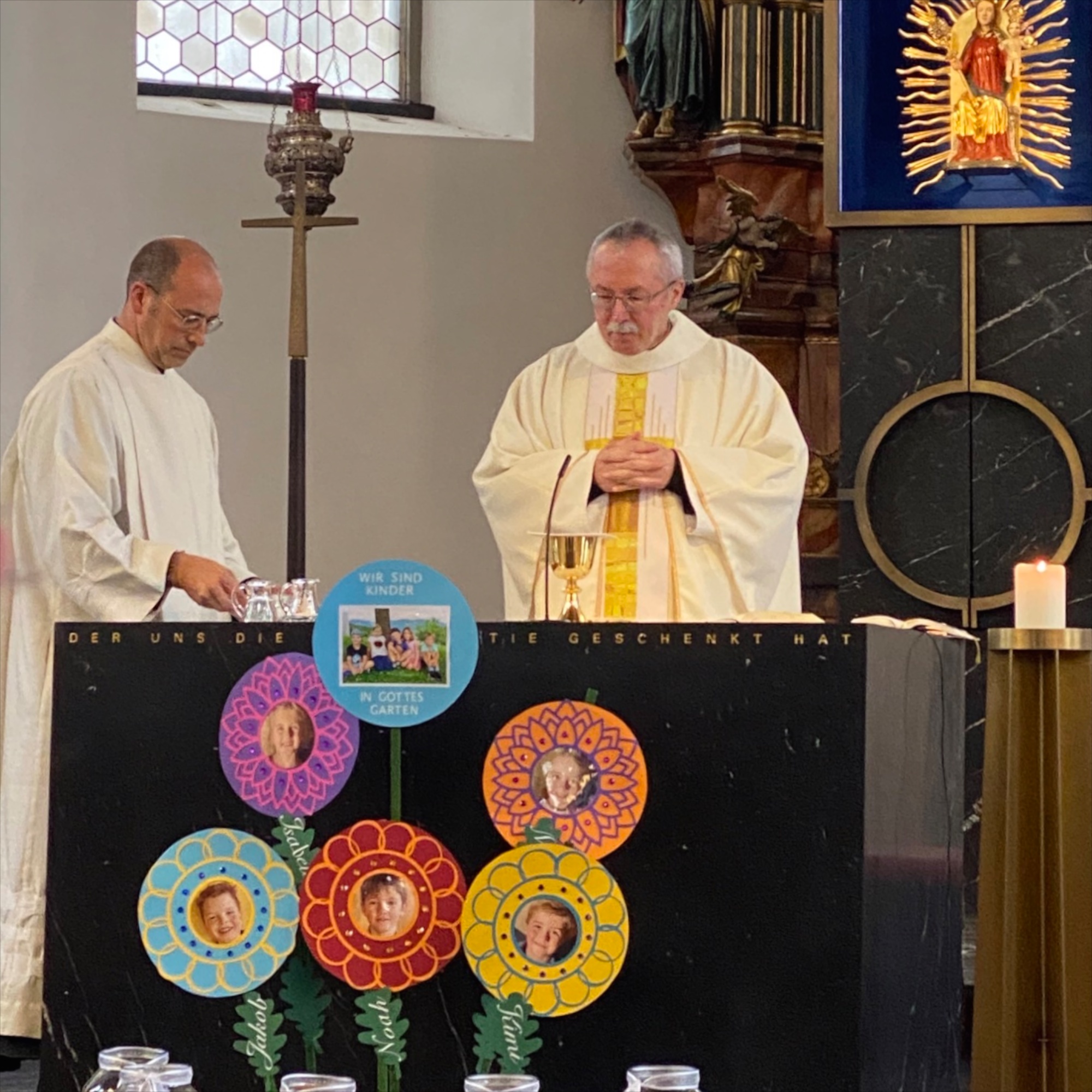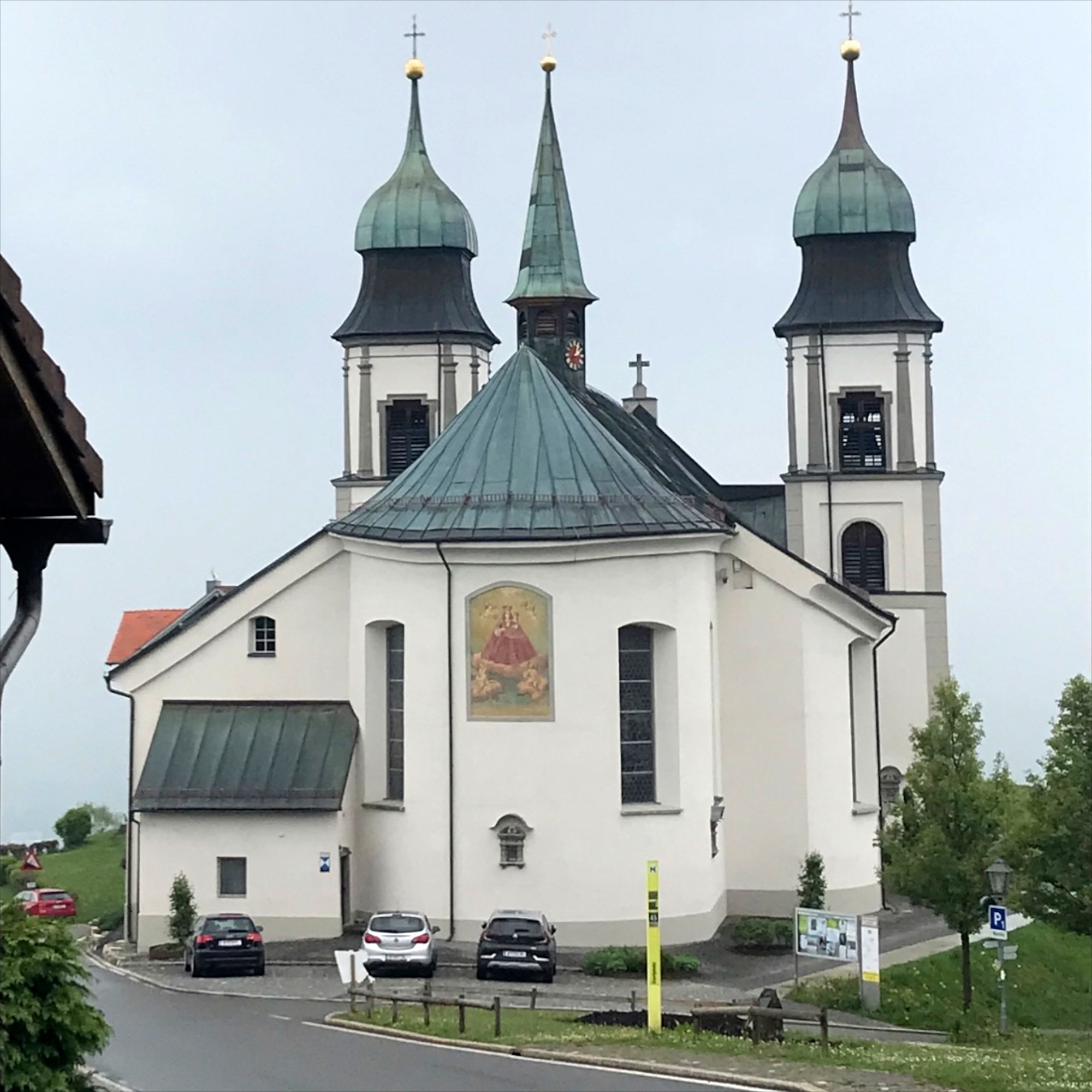 Dazu durften wir am Samstag noch eine Wallfahrt zur Marienbasilika «Bildstein» erleben. Der Ort liegt erhöht über der Gemeinde Wolfurt in der Nähe von Bregenz. Wenn das Wetter schön gewesen wäre, hätten wir Blicke ins Rheintal, auf das Alpsteingebirge und auf den Bodensee werfen können, aber eben, wenn… – leider bescherte genau an diesem Tag der Himmel uns Regentropfen.