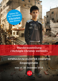 Im Kloster Disentis dürfen wir vom 11.-20. Dezember 2019 die Wanderausstellung «verfolgte Christen weltweit» zu Gast haben, die vom Hilfswerk Kirche in Not stammt. Sie wird in der Schulhalle des Gymnasiums Kloster Disentis stehen. Die Verfolgung und Diskriminierung von Christen ist leider ein aktuelles und vermutlich zu wenig bekanntes Problem. 200 Millionen Christen leiden unter Verfolgung, Diskriminierung und Intoleranz. Alle fünf Minuten wird auf der Welt ein Christ wegen der Zugehörigkeit zu seiner Konfession ermordet. [mehr]