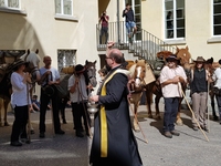 Mit dem Segen von Abt Vigeli brach am Dienstagvormittag eine Säumergruppe mit neun Pferden, zwei Maultieren und Bündner Produkten im Gepäck Richtung Basel auf.