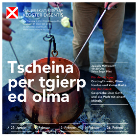 Am 29. Januar starten die besinnlichen Abende in unserer Stiva. Heute und an jedem Mittwoch im Februar sind alle sehr herzlich eingeladen, bei Gratisglühwein, Käsefondue und einer Auswahl von unserer kleinen Karte mit einem Mönch über Gott und die Welt zu sprechen. Um 19.30 Uhr beginnen die Abende.